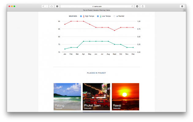 Также сервис отображает среднюю температуру на протяжении всего года для того, чтобы вы могли примерно понять, когда лучше ехать в то или иное место. Более того, Vamo сразу же предлагает вам купить путёвку по самой низкой цене.