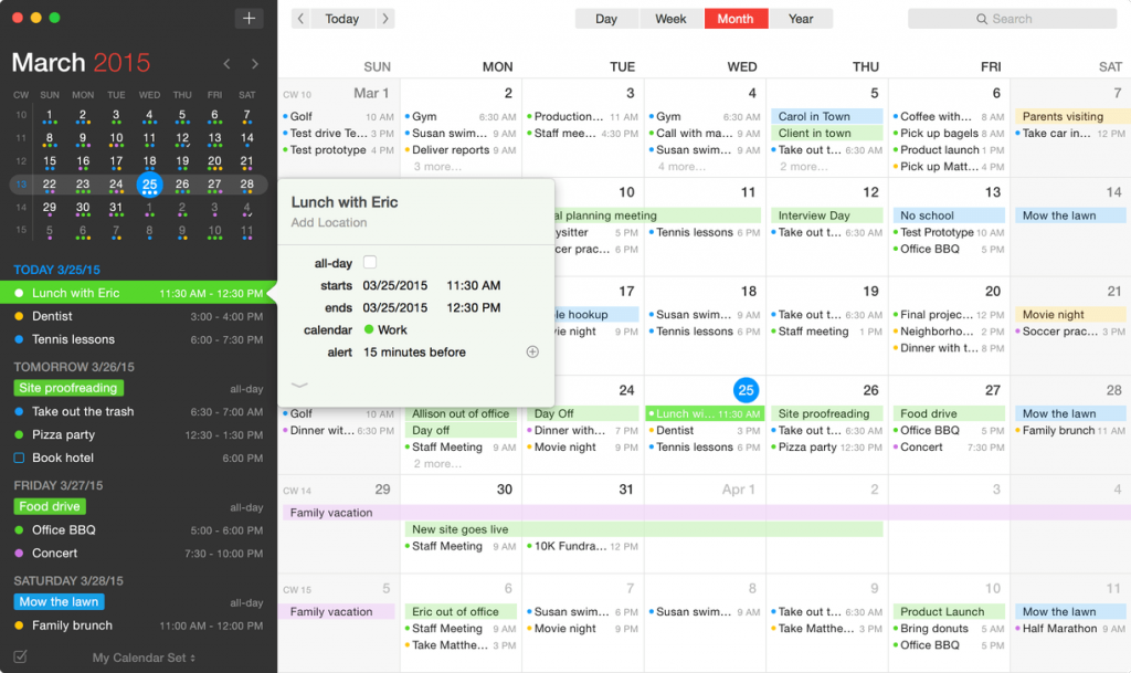 Помимо вышеупомянутых основных улучшений, вторая версия календаря получила и несколько небольших приятных фишек. Например, теперь на выбор есть светлая и тёмная темы, применять которые можно отдельно для каждого из наборов. Кроме календаря, приложение работает и с напоминаниями, а к событиям можно прикреплять геолокационные метки, задавать точное время выполнения и даже импортировать фрагменты данных из других приложений. Не забыли разработчики и об основных особенностях Yosemite: Fantastical обзавелся виджетом центра уведомлений и научился работать в режиме Handoff.