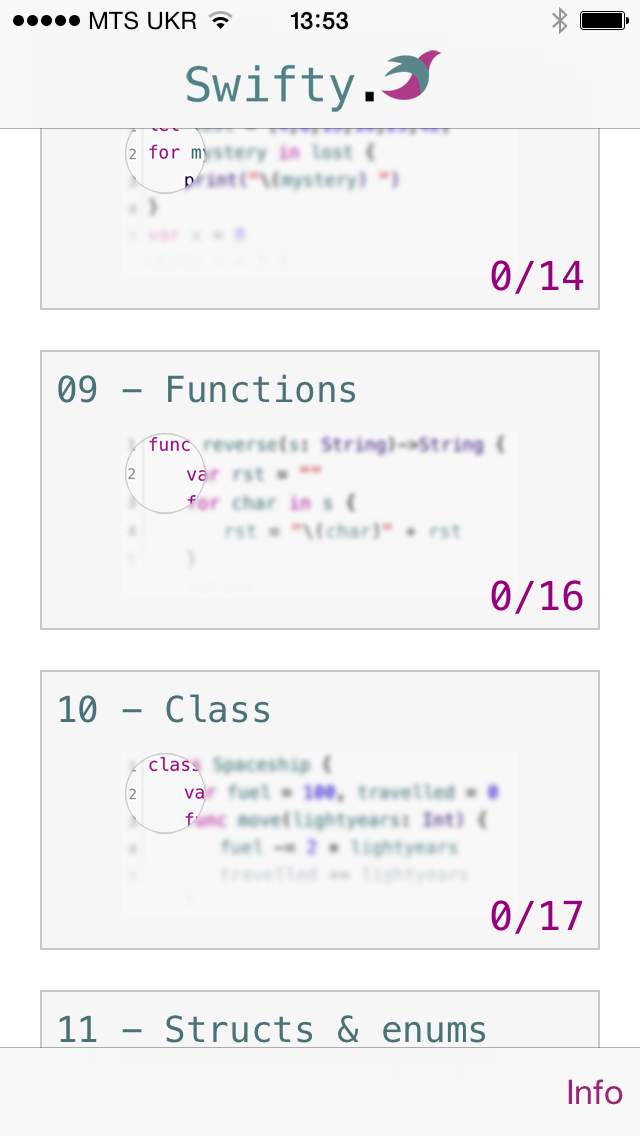 Swifty работает по такой же методике. Перед каждым практическим заданием вам объясняют принцип работы элемента. Затем вам нужно подставить в реальный пример кода то или иное значение.