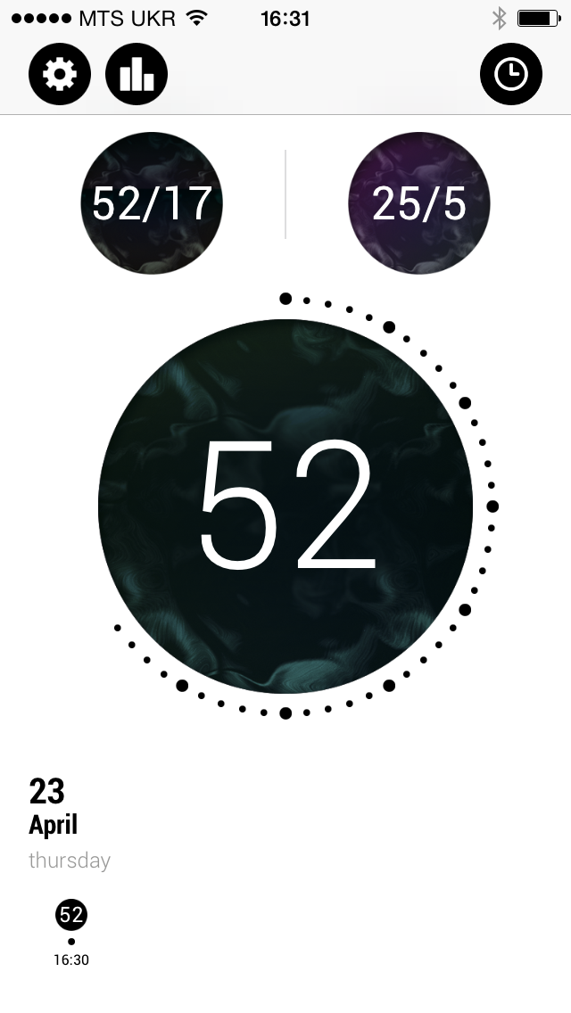 Однако, согласно исследованию компании DeskTime, для более эффективной работы стоит разделить её на отрезки по 52 минуты и отдыхать между ними по 17 минут. Чтобы помочь желающим следовать этой методике, создано приложение 5217 Pomodoro. Оно практически не отличается от конкурентов. Посреди экрана — большое колесо, по клику на которое сразу начинается отсчёт времени.
