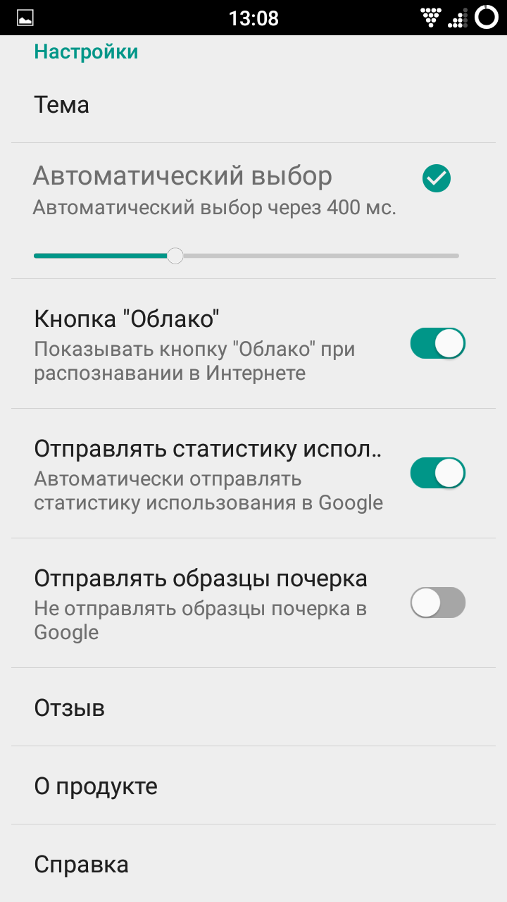 По умолчанию приложение работает в автономном режиме, но вы можете включить в настройках интеграцию с облаком, что ещё больше повысит точность распознавания. Здесь же есть опция отправки образцов вашего почерка в Google, которая позволит программе обучиться именно вашему стилю письма. Параноикам, разумеется, эту настройку лучше не показывать.