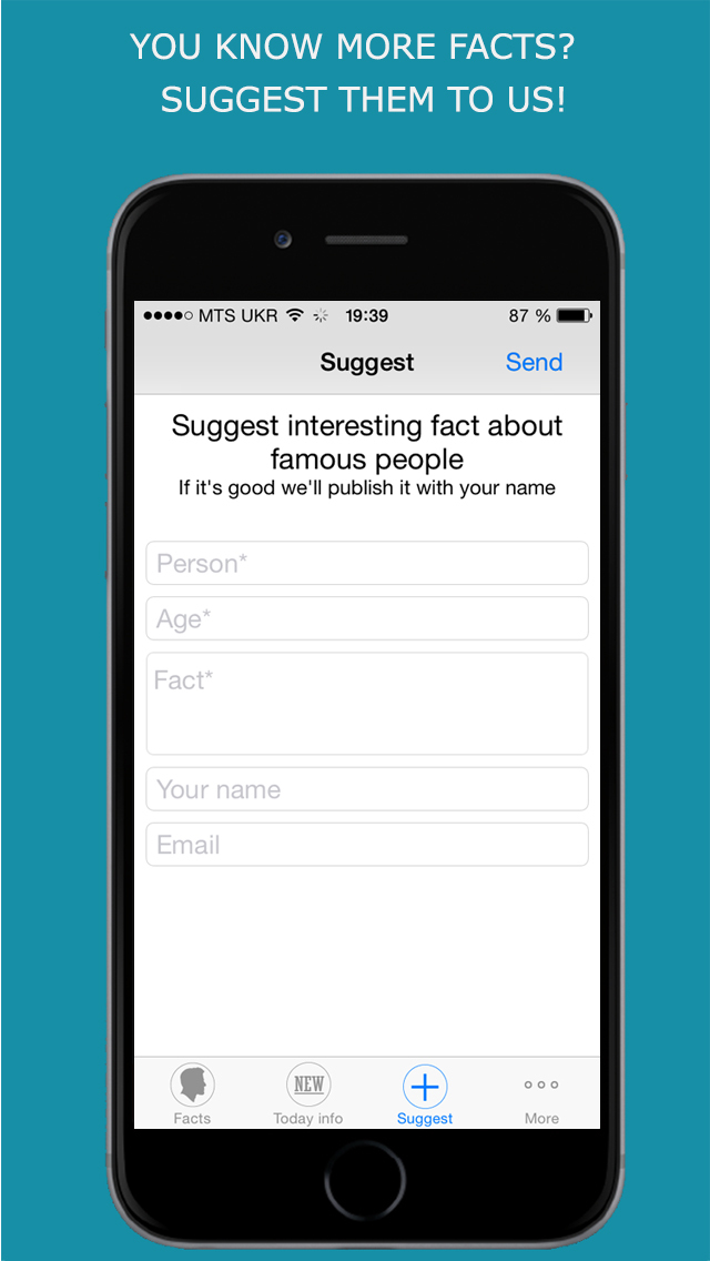 Третья вкладка — то, благодаря чему приложение могло бы быстро наполниться интересными фактами. В разделе Suggest пользователи могут самостоятельно предлагать достижения известных людей. Однако эта возможность доступна лишь владельцам платной full-версии Hurry2Live. Стоит она $3, что непомерно дорого для информационного мобильного приложения. Приобретая её, вы также избавляетесь от раздражающей баннерной рекламы внизу и ограничения в чтении 10 фактов в день. Как бы там ни было, это самый непонятный мне момент новинки.