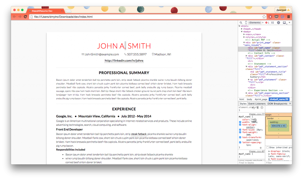 По умолчанию вам предлагается стандартная тема, выбрать можно только один из двух шрифтов, наличие разделительных линий и размер отступов. Если же хочется большего разнообразия, разработчик Ineedaresu.me предусмотрели возможность расширенного редактирования через правку CSS-файла базовой HTML-страницы резюме. Это можно сделать в Chrome или любом редакторе кода. Информация правится через файл tests.js. В целом внести базовые изменения в ваше резюме таким образом достаточно просто.