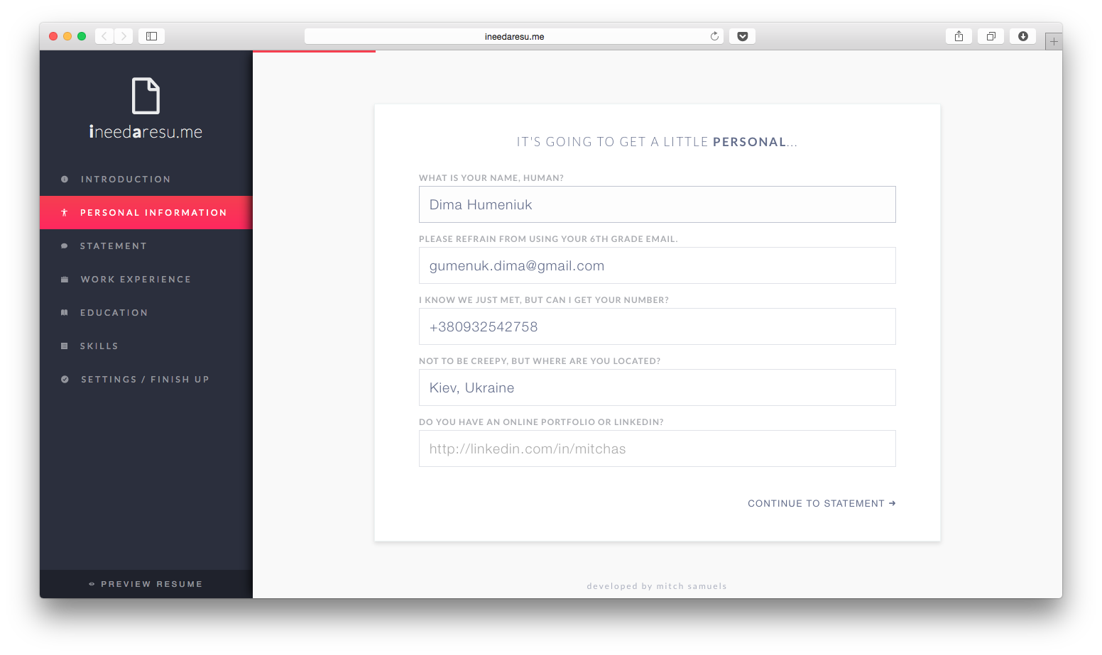Весь процесс составления резюме условно разделён на шесть шагов, в каждом из которых вам нужно будет просто заполнять соответствующие поля. В любой момент можно просмотреть превью результата. Чтобы не быть голословным, я создал своё резюме кандидата на вакансию автора новостей для редакции Лайфхакера. Это заняло всего 15 минут. Если же в процессе составления вам нужно будет отвлечься или отлучиться, то Ineedaresu.me сохранит прогресс и вы сможете продолжить в любой удобный момент.