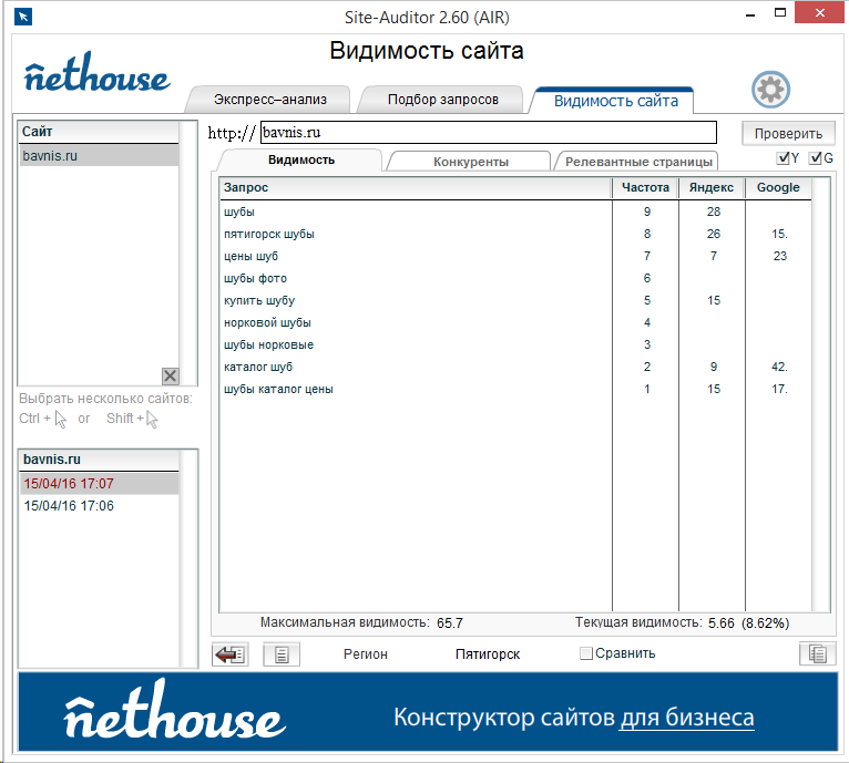 Остаётся запустить проверку на видимость. Программа выдаст позицию сайта по каждому из указанных запросов.